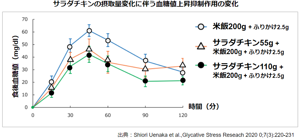 下のグラフは、「米飯(200g)のみを食べたグループ」と「米飯にサラダチキン55g or 110gを足したグループ」の血糖値上昇を比較したものです。